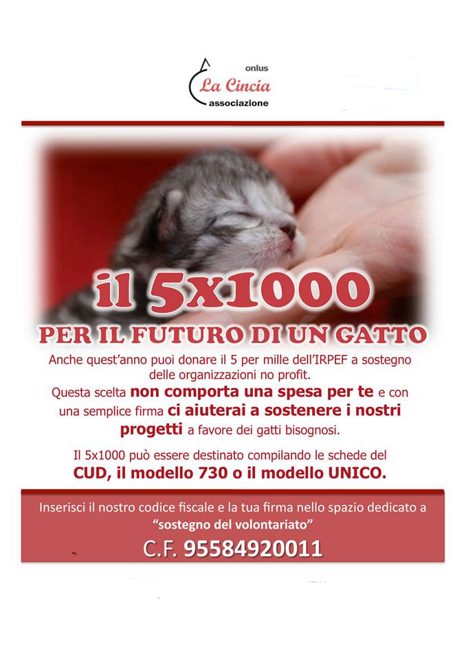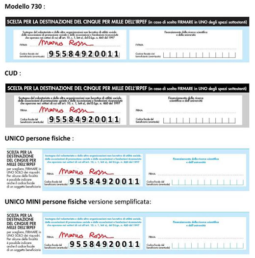 Da non dimenticare l'opportunità offerta dal 5 per mille. Per sostenerci in questa forma, che ricordiamo non "costa" nulla al contribuente, basta riportare il nostro codice fiscale 95584920011 nella prima casella contrassegnata come "Sostegno del volontariato e delle altre organizzazioni non lucrative di utilità sociale..."